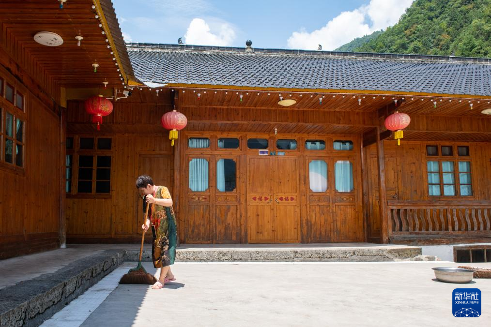 下坪乡周家院子的主人熊翠兰在打扫院子(8月17日摄)。