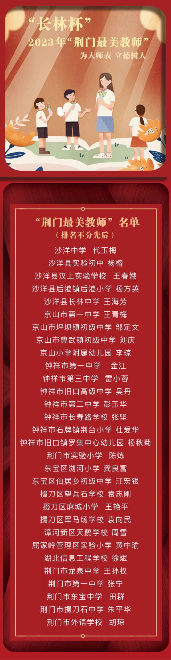 在第39个教师节到来之际,市教育局联合荆门九派通融媒体中心、北京长林公益基金会在全市教育系统开展“长林杯”2023 年寻找“荆门最美教师”公益宣传活动。目前,评选结果出炉。