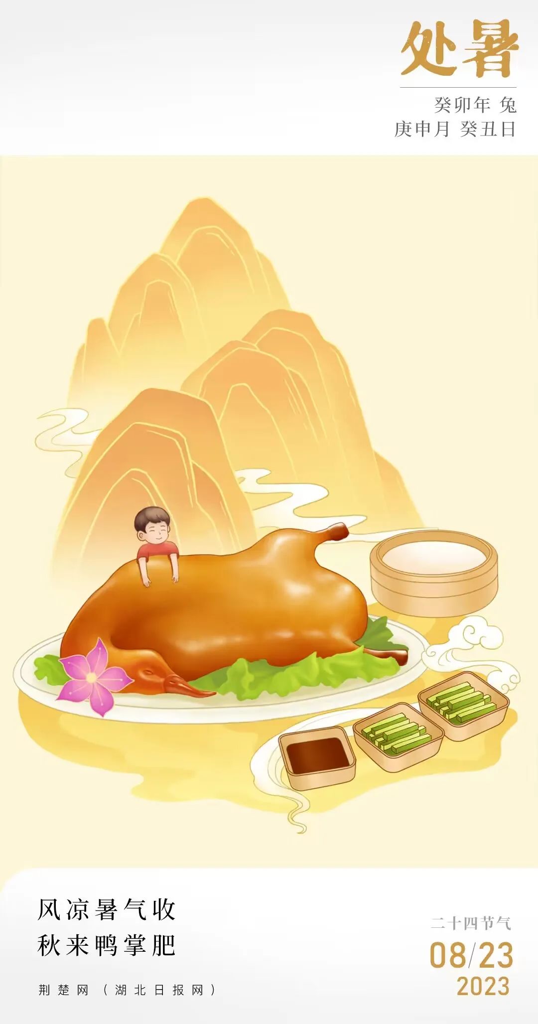 处暑前后,正是鸭子最肥美的时节。鸭肉味甘性凉,营养美味,既防秋燥,又适合秋季进补。民间有“处暑送鸭,无病各家”的说法,意思是处暑炖好鸭子送亲友品尝,可保家家健康无恙。