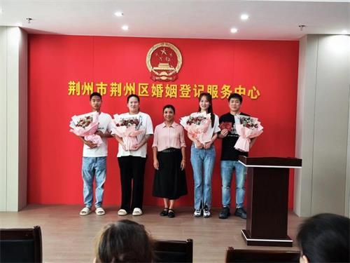 七夕节当日,甜蜜氛围席卷全市婚姻登记服务机关,各地民政部门顺势开展七夕主题活动,展开浪漫助攻。荆州区开展“扬婚恋新风•筑幸福家庭”活动,集中为新人颁证送祝福;沙市区民政局长喜当“证婚人”,为结婚新人办理结婚登记手续;公安县为结婚新人送上婚检服务;石首开展“缘定石首•情暖七夕”活动,组织新人集体求婚、宣誓;松滋市开展“会聚良缘•缘定七夕”活动,组织新人开展互动游戏、拍照打卡;监利市为准新人提供婚姻咨询服务;洪湖市开展“情浓七夕•真爱永远”活动,为新人制作七夕海报、发放宣传册等。丰富多彩的活动,简约庄重的仪式感,让新人普遍感受到“中国式浪漫”。