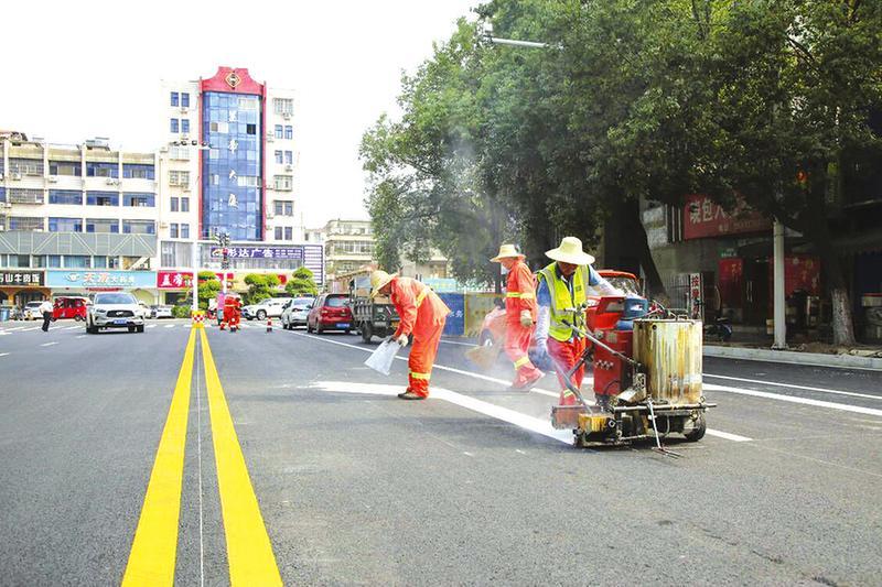 经过5个月的连续奋战,8月18日,随州城区舜井大道(青年路至解放路段)改造项目主车道竣工通车,转入人行道施工建设。该项目是我市2023年度城市建设重点项目之一,预计今年10月份全面完工。图为市政工人正在施划道路标识标线。 (随州日报通讯员聂少峰摄)