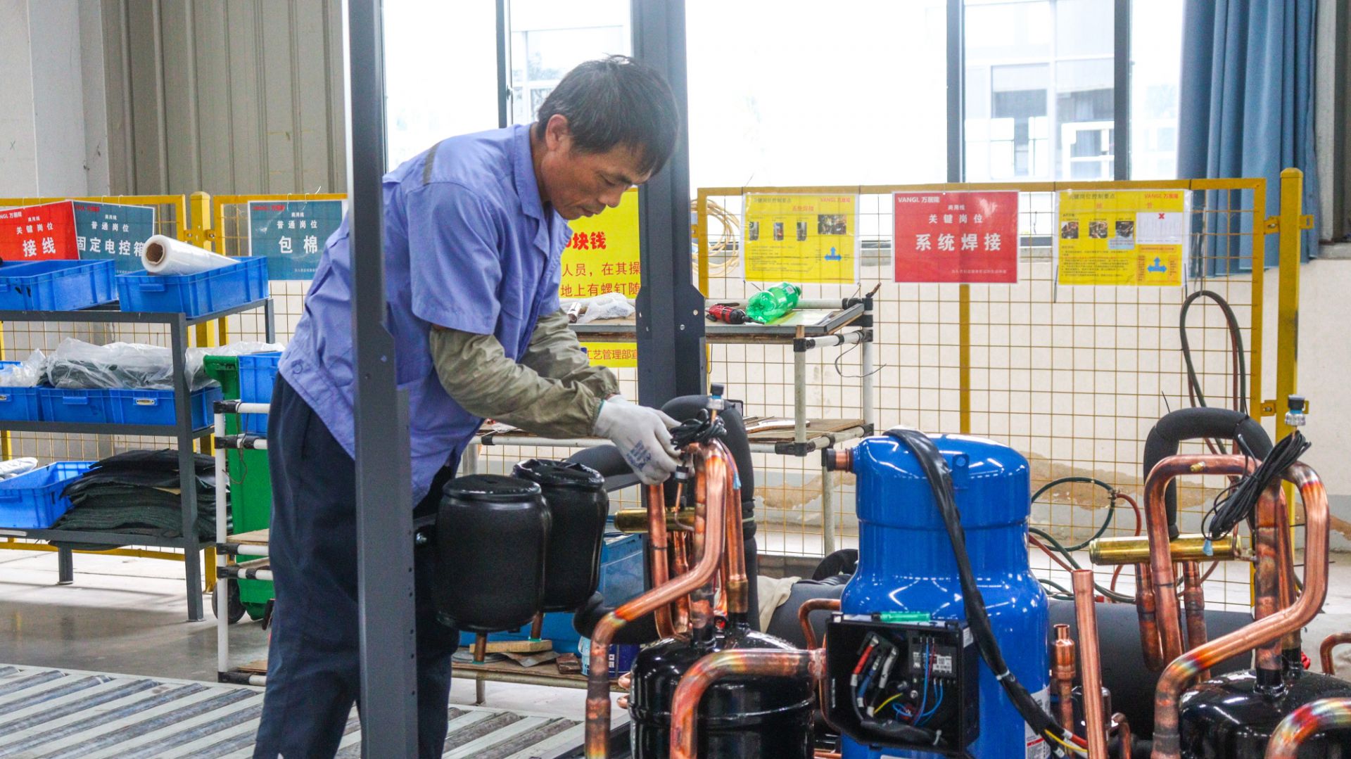 近日,记者探访武汉万居隆生产车间一线,在家用机生产线上看到,工人们正各司其职,忙着完成焊接、组装、检测等道道工序,赶制一批批“水空调”产品。平均每30秒就有1台家用外机组装完成下线。