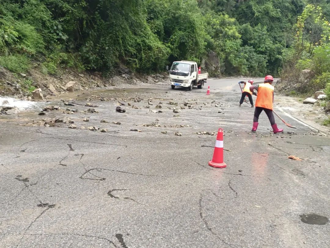 ▲ 聂家河镇对镇辖区路段进行巡查,陆渔路段发现两处山水冲击的落石,巡查人员及时清理部分碎石、设置反光锥,并对西邓线垮塌段进行清障。