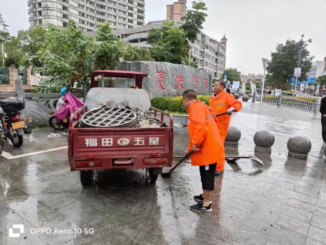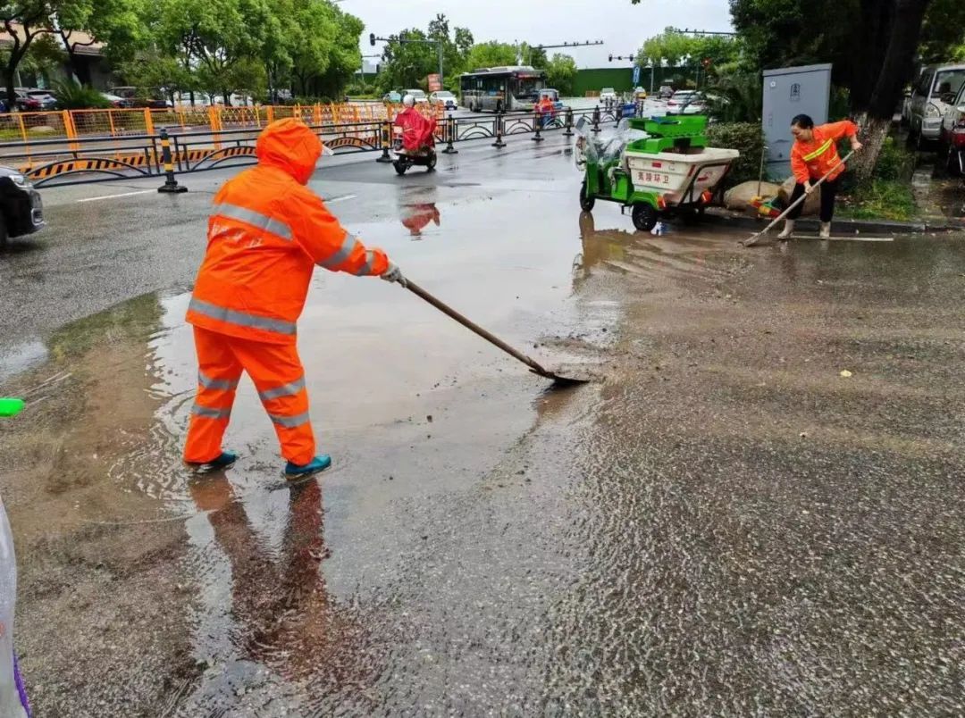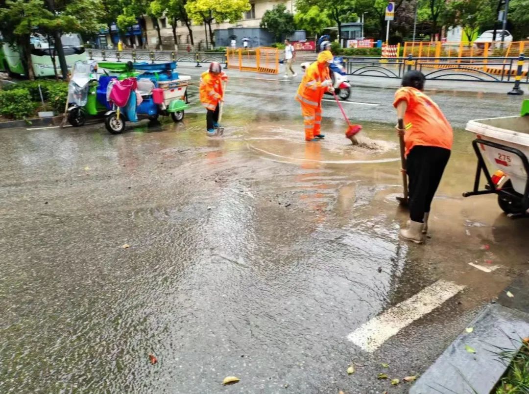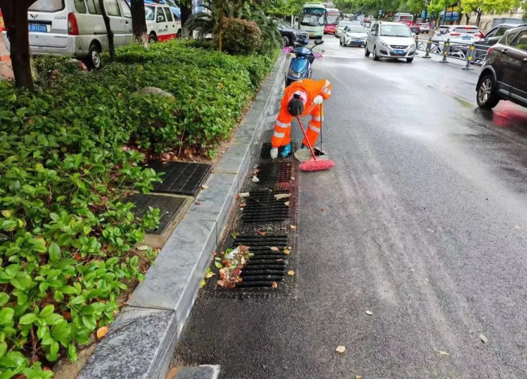 环卫处迅速组织作业人员清扫被雨水冲积、紧粘在路面的泥沙、落叶、树枝等,人工疏通下水道泄水口,积极做好道路积水清理、隐患排查工作,确保及时恢复雨后辖区环境卫生面貌。