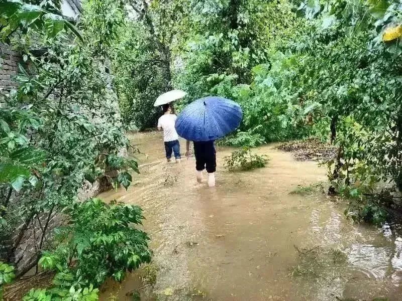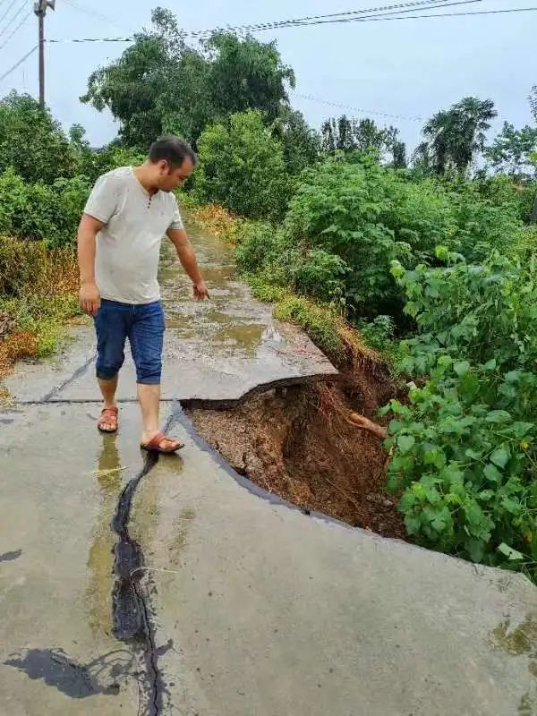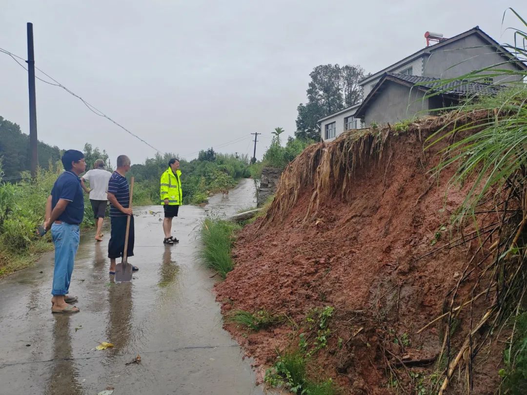 ▲ 陆城亮家垴村对地势低洼处农户及时排查险情,并对道路垮塌处进行现场查看。
