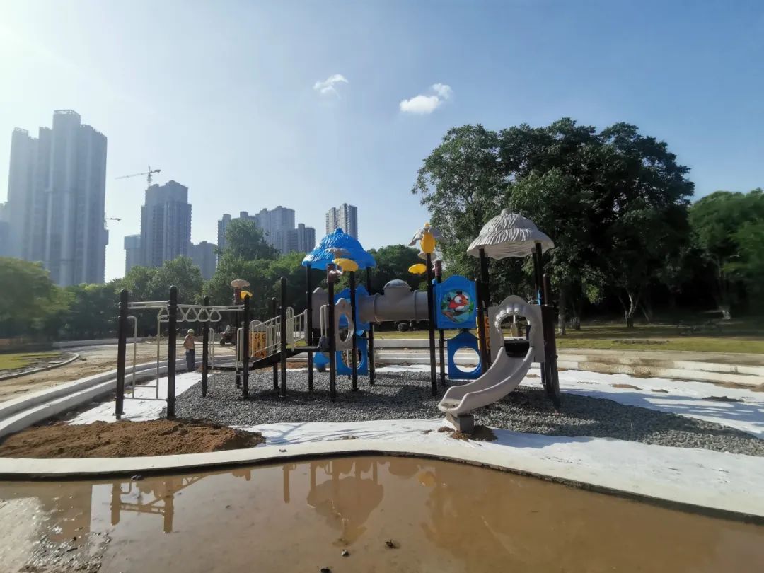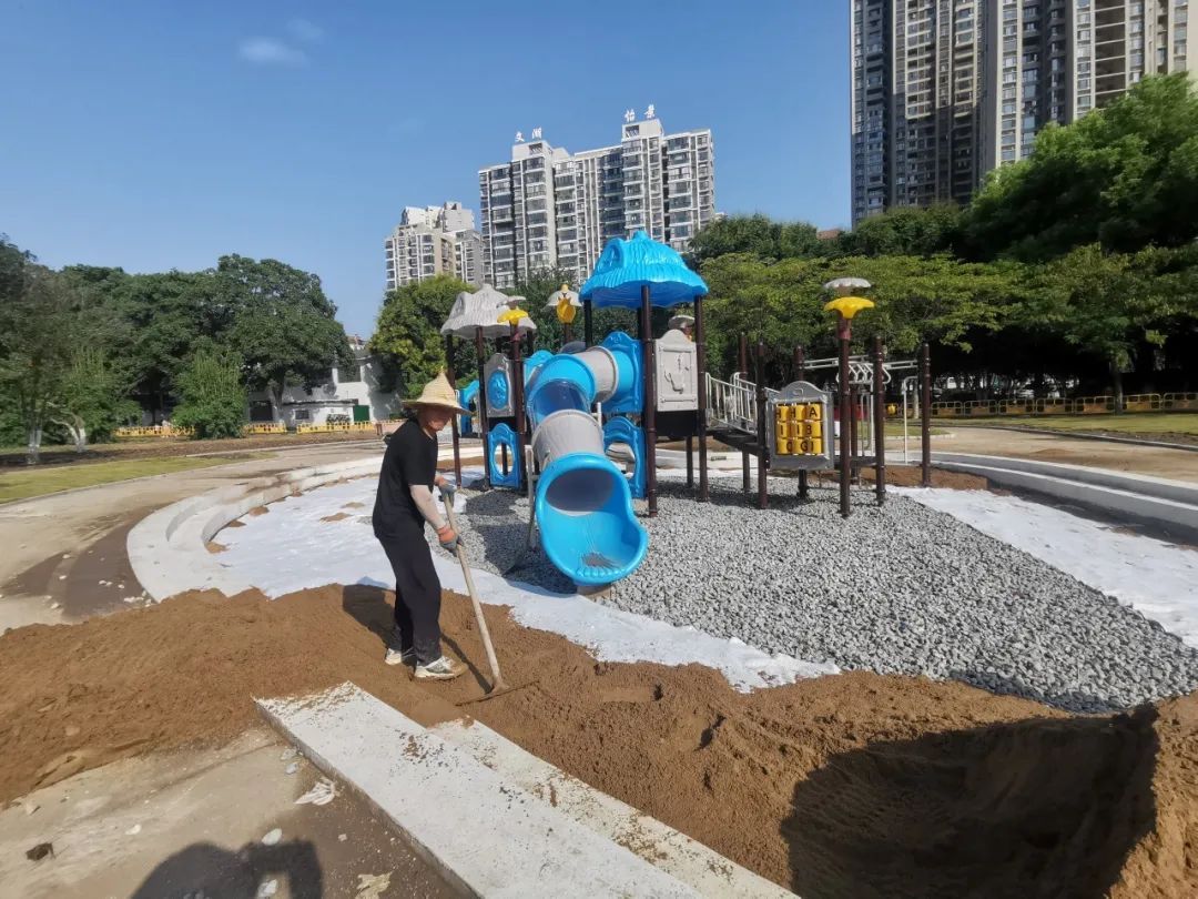 桂花山北侧空地修建儿童游乐区、老年人健身区、彩色沥青游步道,铺设3000多平方米的草地,周边栽种木槿、榉树、重阳木等多种植物,进一步满足附近市民小孩休闲娱乐的需求;