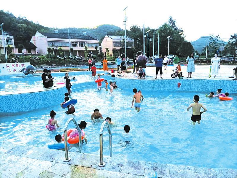 来到贾家湾村易地搬迁点的文化广场,数十名儿童在游泳池里嬉戏,成群结伴的村民在广场或打球或跳舞,一片和谐美好的景象。