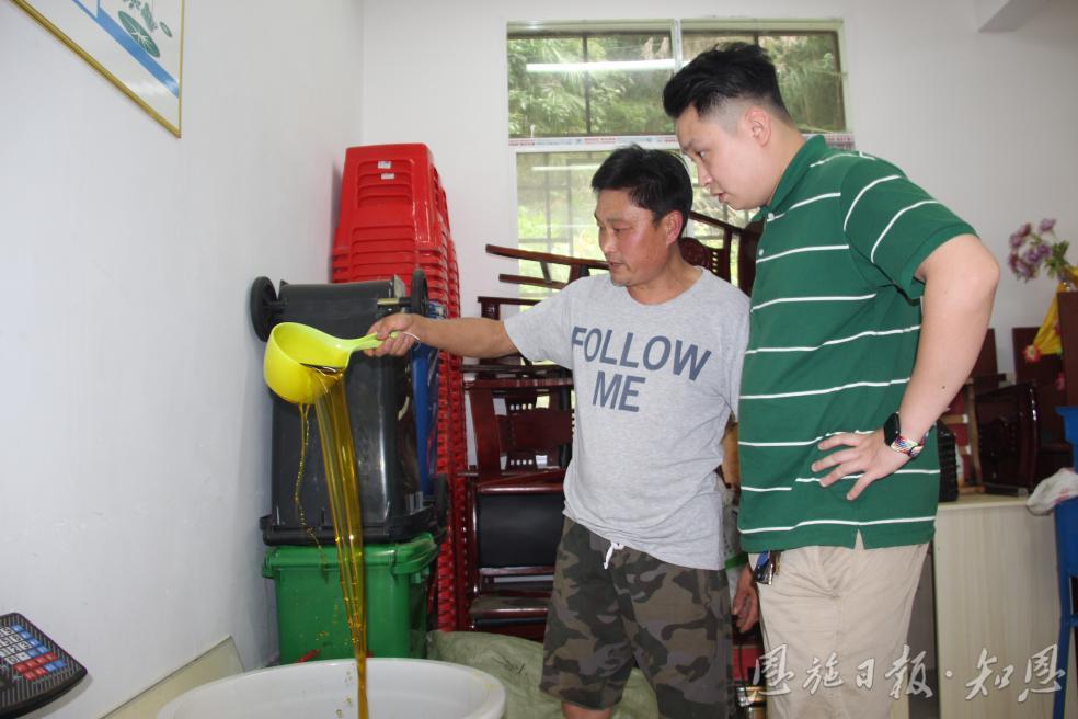 8月28日,在建始县长梁镇三宝村,村纪检委员向泽兵正在查看菜籽油加工坊生产情况。