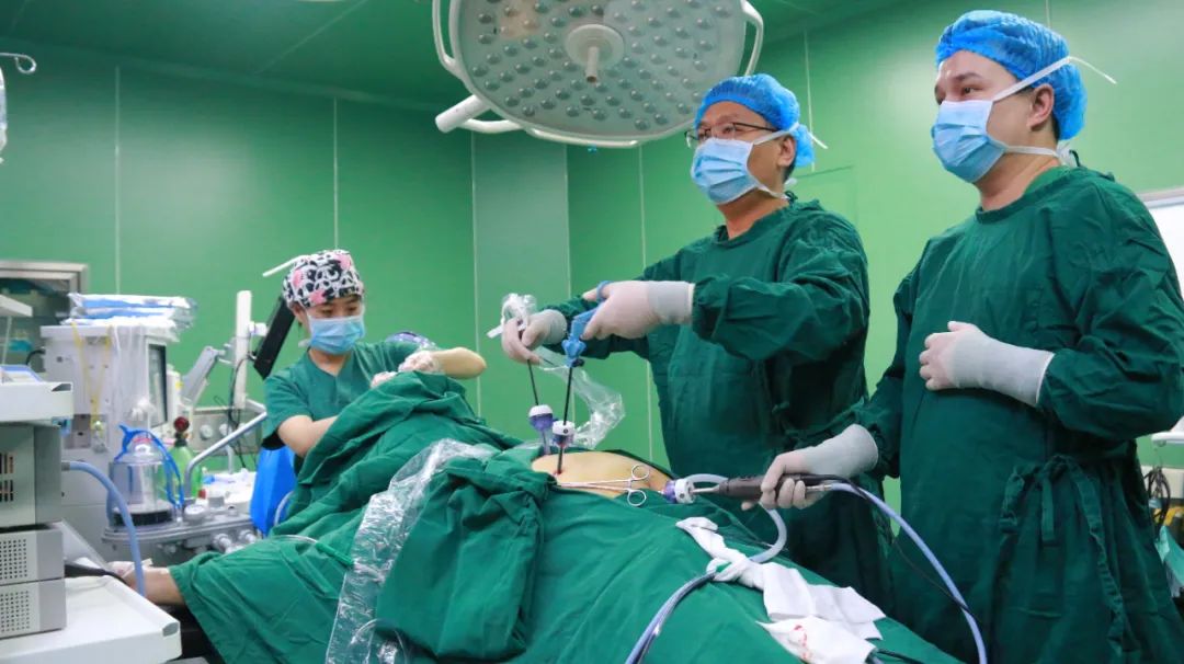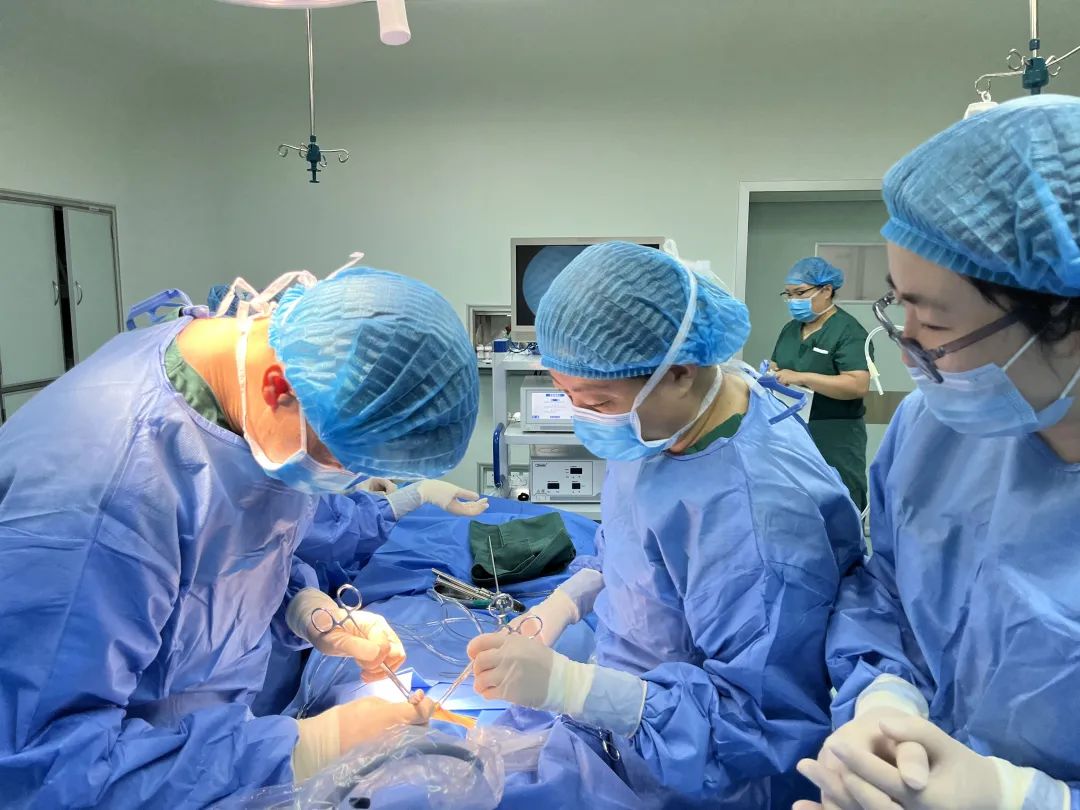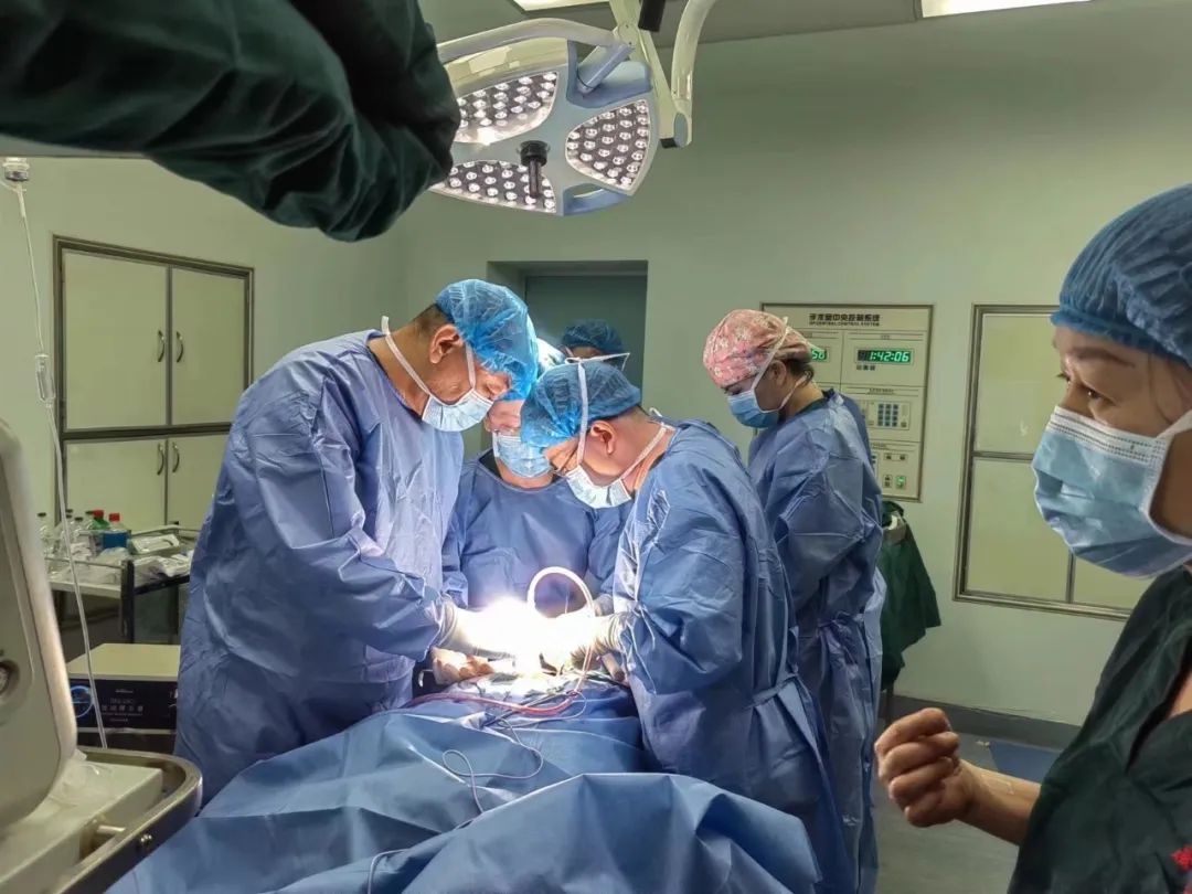 援疆医生柯文波(左)在州人民医院成功为一例复杂胆道疾病患者实施肝总管空肠 Roux-en-Y吻合术。