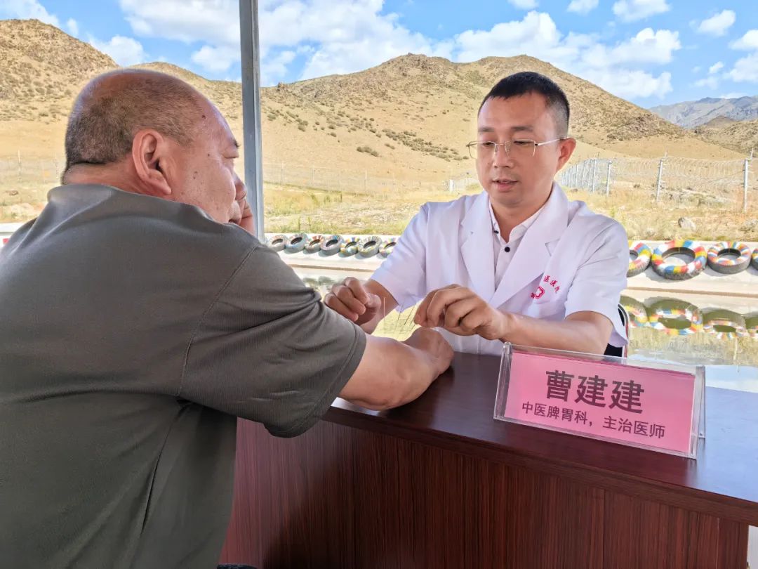 湖北省援疆医生曹建建赴第五师86团塔拉特边境警务站和89团小喀拉达坂边境警务站为民兵开展中医针灸治疗。