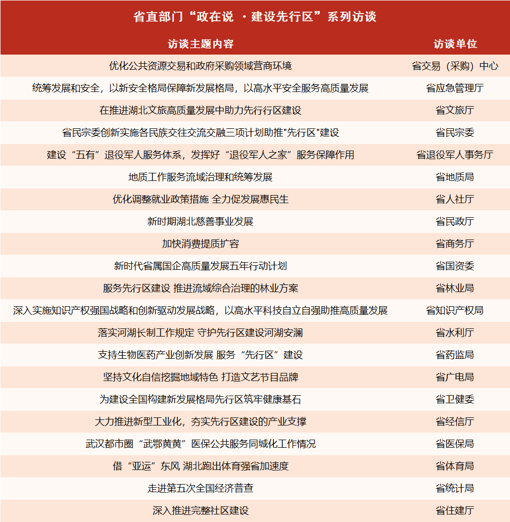 经省政务办批准,今年在线访谈计划开展33场,涉及省应急管理厅等21家省直部门、鄂州市等12家市(州)政府。为着力推进全国构建新发展格局先行区建设,健全区域协调发展政策机制,推动中心城市和都市圈高质量发展,访谈将围绕“政在说•建设先行区”为主题展开。