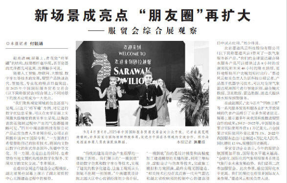 同样,湖北的“新板眼、黑科技”也受到《科技日报》的关注,该报以《新场景成亮点“朋友圈”再扩大》为主题,报道了服贸会各大展团的亮点。其中,稿件着重采访了湖北展团演示的“无图建造过程中的模型”,借助数字仿真和数字孪生等技术,实现了建筑的数字化建造,让施工现场从头到尾不出现一张图纸。