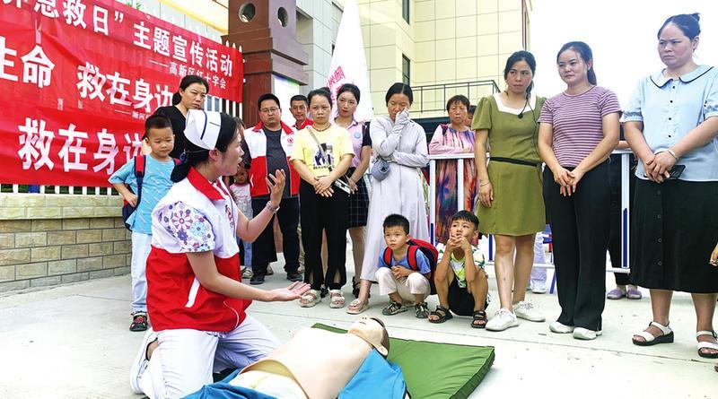 9月9日 “世界急救日”前夕,随州高新区医院红十字会组织开展急救知识宣讲进校园活动。图为医务人员向云龙小学幼儿园师生进行溺水后心肺复苏等急救方法培训。(随州日报通讯员余洋摄)