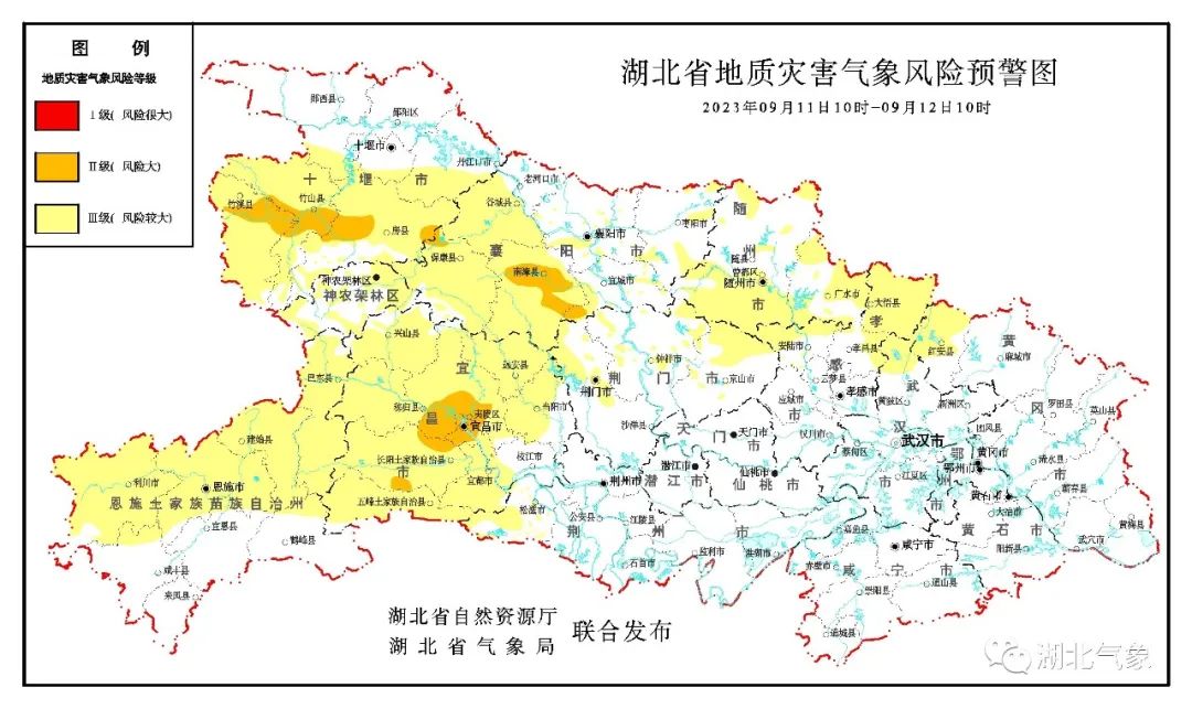 2023年9月11日10时—9月12日10时,预计三峡库区,神农架林区、襄阳地区、宜昌地区、随州地区,十堰(十堰市城区南部、郧阳西南部、竹溪、竹山、房县、丹江口南部)、恩施(恩施市、建始、利川、咸丰北部、宣恩北部、鹤峰北部)、荆门(荆门市城区、钟祥、京山)、荆州(松滋)、孝感(大悟、安陆、孝昌东北部)、武汉(黄陂北部)、黄冈(红安中部和北部)以及其他强降水区域发生崩塌、滑坡、泥石流的风险较大;其中,十堰(竹溪中部和东部、竹山中部、房县中西部和东部)、襄阳(保康北部局部、南漳中部和东南部、宜城西南部)、宜昌(宜昌市城区西部、夷陵南部、长阳东北部和南部)发生崩塌、滑坡、泥石流的风险大。