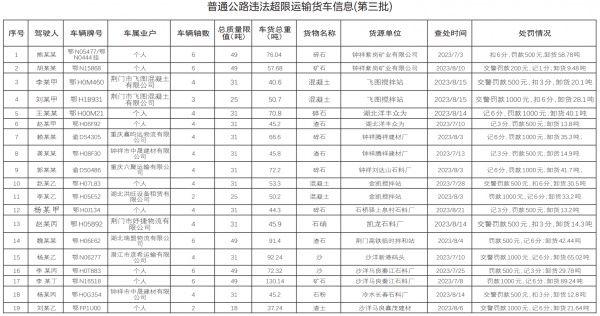 此次通报为第三批,查处时间为今年7月至8月。其间,我市相关部门重点针对超限超载车辆源头违法装载行为加大查处力度,还溯源追踪违法超限装载企业,本轮约谈整改企业10多家,并对部分企业违法装载行为进行了罚款等(见下表)。今后,我市还将不定期通报。(记者杨涛 通讯员张小海)