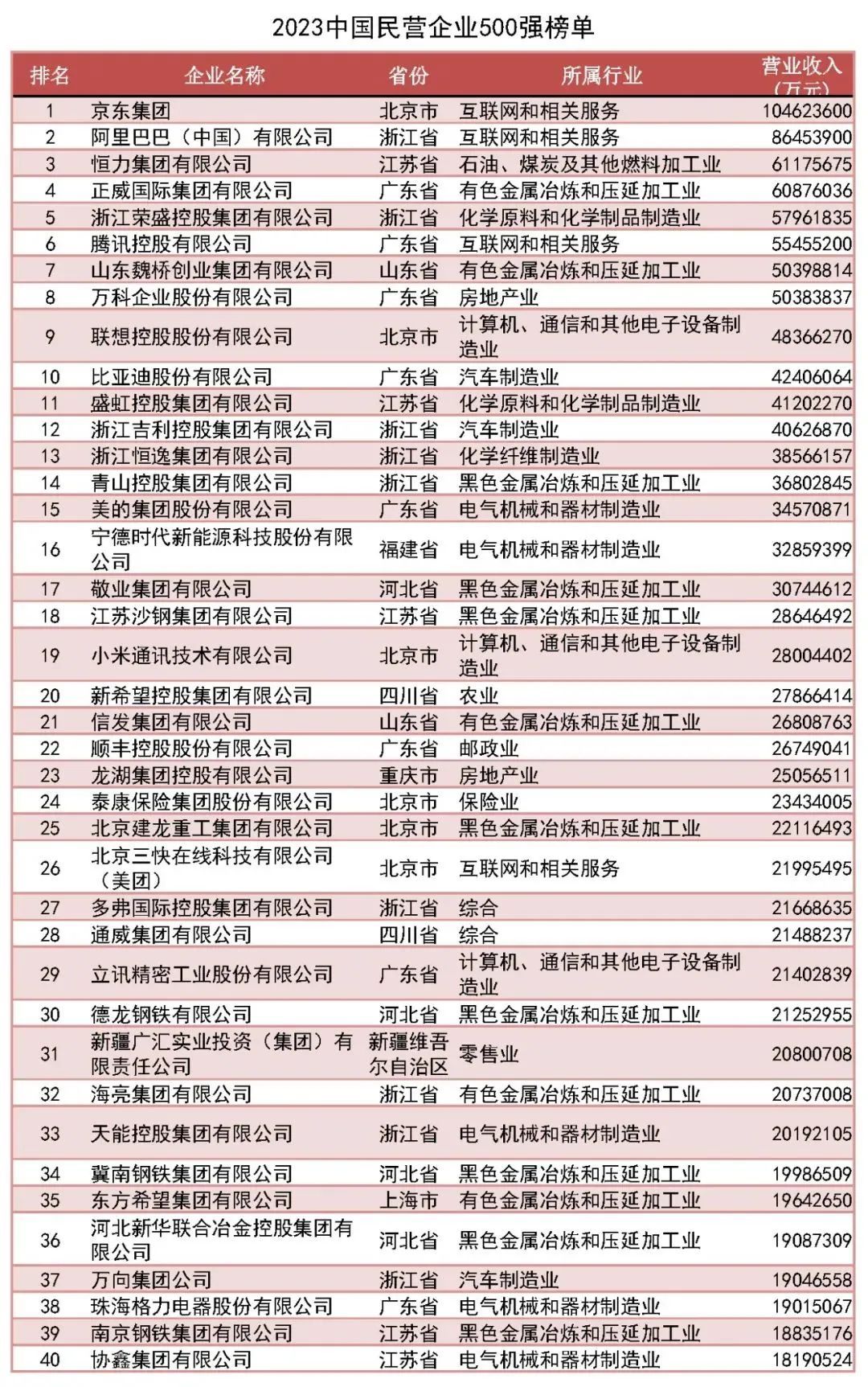 京东集团、阿里巴巴、恒力集团、正威国际、浙江荣盛位居2023年中国民营企业500强榜单前五位。