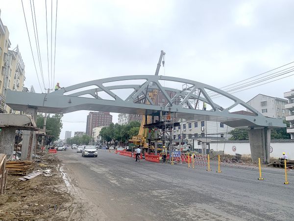 10日,钟祥城区安陆府路人行天桥主体桥面成功吊装后开始焊接。该人行天桥位于钟祥三中校门西侧约50米处,主桥跨度31米,全长为35米,桥面净宽3.6米,总宽4.9米,为钢桁拱结构。(记者 李天学 通讯员 杨娅澳 摄)