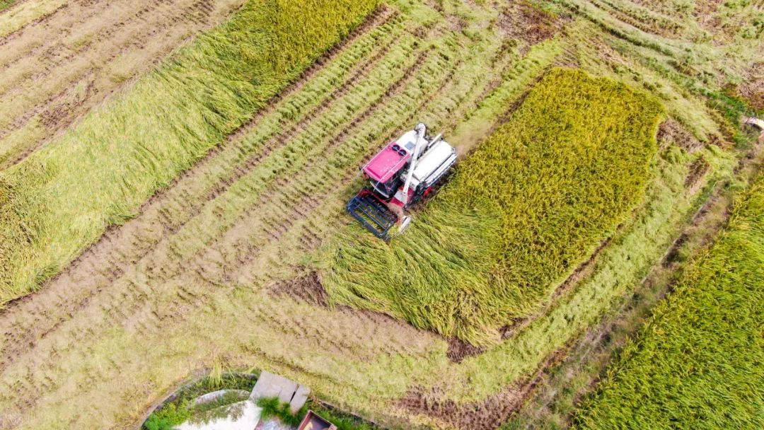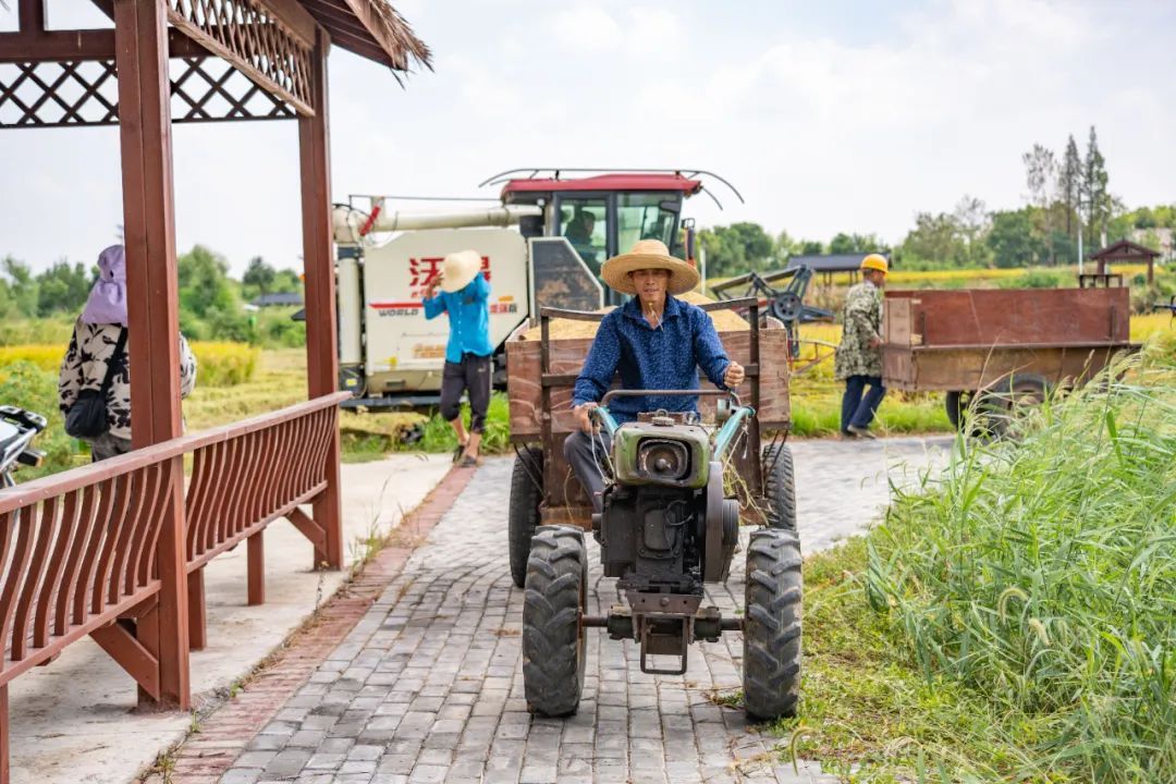 走在田间地头,数10台收割机在金色的稻田间来回穿梭,将一簇簇颗粒饱满的稻谷卷进脱粒齿仓内。村民们忙进忙出,赶着搬运、晾晒刚刚收割下的稻谷,一派丰收繁忙景象。