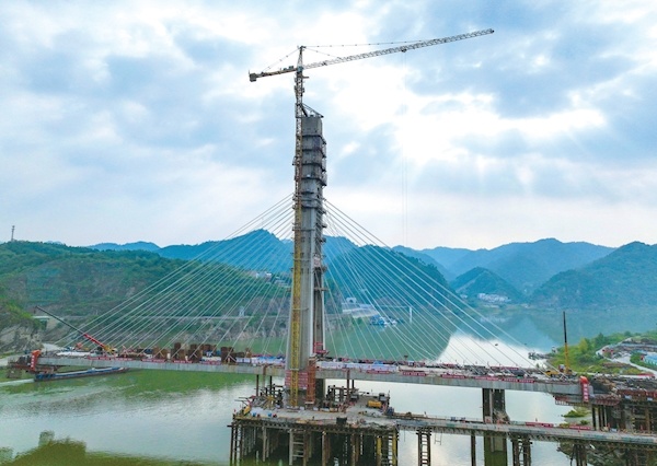 昨日,十巫北高速汉桥特大桥主塔封顶。该桥从郧阳区五峰乡跨越汉江与郧西县观音镇连接,大桥全长694米,其中主跨370米,为双塔双索面钢混组合梁斜拉桥。