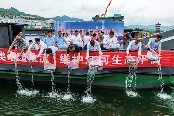 9月10日,竹山县组织人员在上庸镇圣水湖增殖放流草鱼、鲫鱼、黄颡鱼、花白鲢等鱼苗10万余尾,通过增殖放流,维护水生态环境平衡和物种多样性,促进水体良性循环,改善净化流域水质。近年来,该县在堵河流域严格实施全面禁渔,先后投放各类鱼苗150万尾,注入丹江口水库的河流水质常年保持在国家Ⅱ类标准以上。通讯员石濡华摄