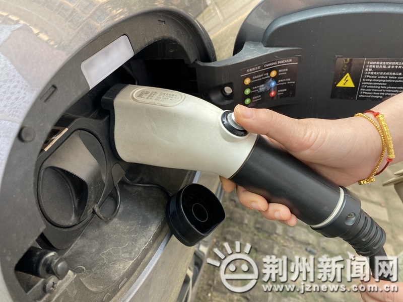 在荆州日月星国际华侨城小区,市民夏女士正在给新能源汽车充电。