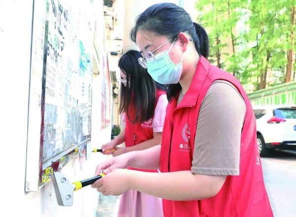 东宝区龙泉街道西门社区工作人员、居民志愿者共同清理墙面“牛皮癣”,营造整洁文明的城市环境。张彩云 摄