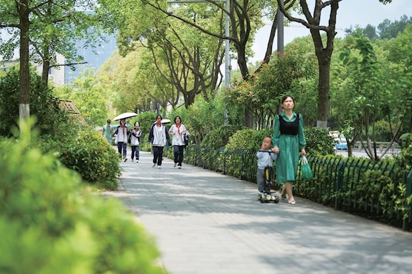 北京路沿线绿植枝繁叶茂、绿意浓浓,市民行走在林荫道上轻松又惬意。(资料图片)