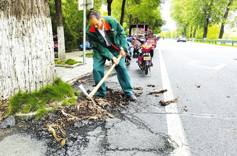 为推动文明卫生城市创建走深压实做细,确保城区行人车辆安全,从9月下旬开始,市城管执法委绿化管护中心和市政服务中心联合开展“除路障保安全”专项行动,针对城区部分行道树树根凸起、裸露地面现象,组织园林(市政)工人全面排查处理,清理裸露树根,修复损坏路面,消除道路交通安全隐患。图为9月22日,园林工人正在清理白云湖东堤北段裸露树根。 (随州日报通讯员聂少峰摄)