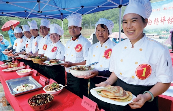 9月23日,丹江口市白杨坪林业开发管理区举行首届乡村美食大赛暨守水护水文艺汇演活动。20余家乡村农家乐的30余名厨师同台竞技,开展厨艺比拼,为游客带来盛宴,丰富乡村旅游内涵。记者潘世新摄