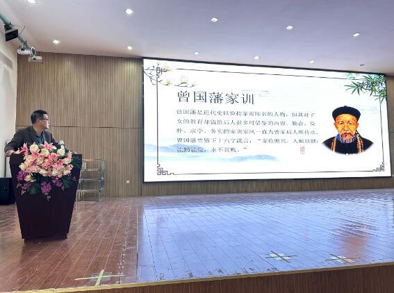 湖北中医药高等专科学校马克思主义学院副教授何斌受邀以《传承家风家训弘扬传统美德》为主题,为100余名中学生分享了中国传统家风家训文化。何斌从“什么是家风”“家风表现在什么地方”“家风与班风、校风、国风”等方面对中国传统家风家训进行讲解,引经据典、事例丰富地阐明了家风家训对个人、学校、家庭、社会、国家的重要意义,传承优秀家训文化,涵养良好家风家教。