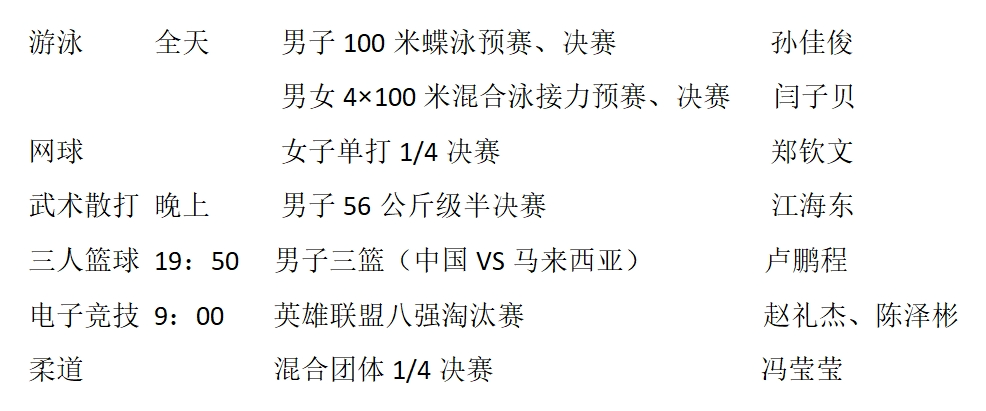 今天,湖北省运动员还将参加游泳、网球、武术散打、三人篮球、电子竞技、柔道等项目比赛。