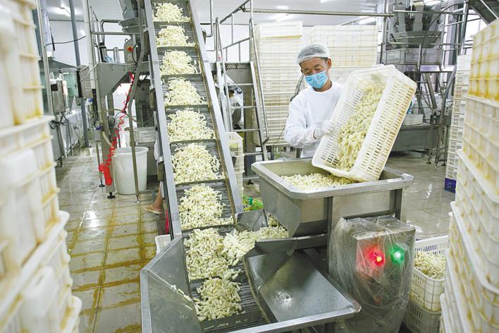 泡藕带成为华贵公司的明星产品,年销售额达14亿元。图为今年6月华贵公司泡藕带生产车间。(通讯员 王童 摄)
