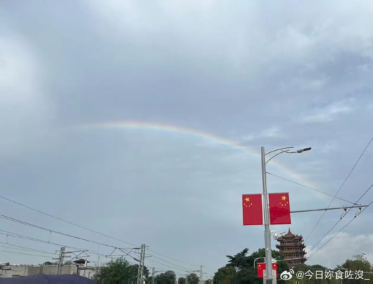 今天是9月30日,中秋国庆假期第二天。秋雨洗刷过的武汉,在下午17时间左右迎来难得一见的彩虹。很快,大家通过网络平台,晒起了各自拍下的彩虹美照。雨后彩虹为前来武汉旅游的市民们带去了这份超级黄金周的意外喜悦,他们在各个景点前也留下了彩虹与景点的珍贵合影!