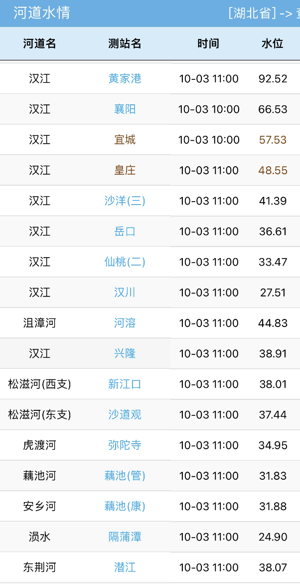 10月3日上午,汉江中下游各站点水位持续上涨。11时,钟祥皇庄站48.55米,超警戒水位0.55米。目前宜城至皇庄站全线超警。