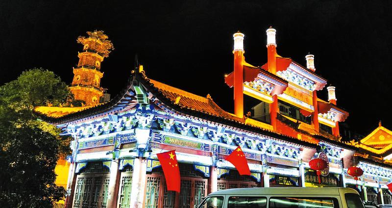 为提升随州城区地标文峰塔的知名度,打造文峰塔广场地域文化新名片,曾都区东城街道近期对文峰塔广场实施景观亮化改造升级,增添照明设备,完善景观设施,营造恢宏大气、璀璨绚丽的亮化效果。图为10月6日文峰塔广场北楼夜景。 (随州日报通讯员 聂少峰摄)