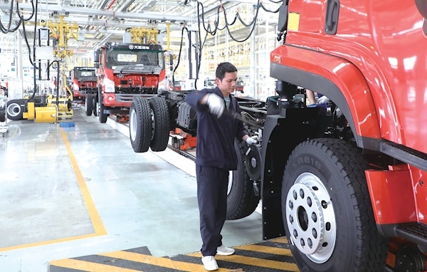 10月7日,湖北大运汽车有限公司工人在赶制整车订单,车间呈现一派繁忙景象。据悉,从10月4日开始,企业设备满负荷运转,工人们争分夺秒抢进度赶订单。