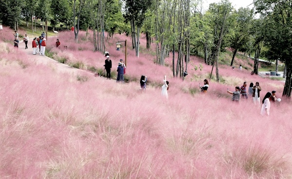 10月9日,市民在郧阳区解放军青年林主题公园欣赏粉黛乱子草丛。该公园粉黛乱子草轻薄如雾、绚丽似霞,在阳光照耀下朦朦胧胧、令人沉醉。据了解,该公园是一个集文化纪念、休闲娱乐、生态保护于一体的综合性生态公园,吸引不少市民在此享受悠闲惬意时光。记者潘世新通讯员王楚云摄
