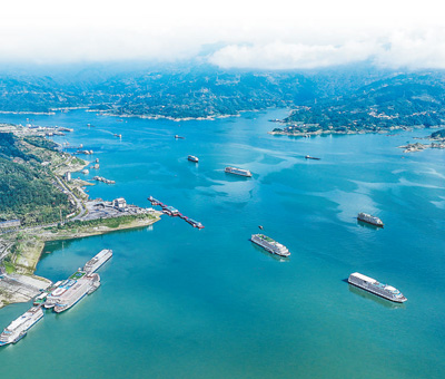 位于三峡大坝上游的宜昌市秭归县,游轮在航道上有序行驶。