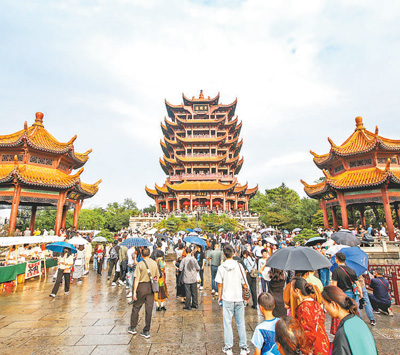 中秋国庆假期,武汉黄鹤楼公园迎来众多游客。