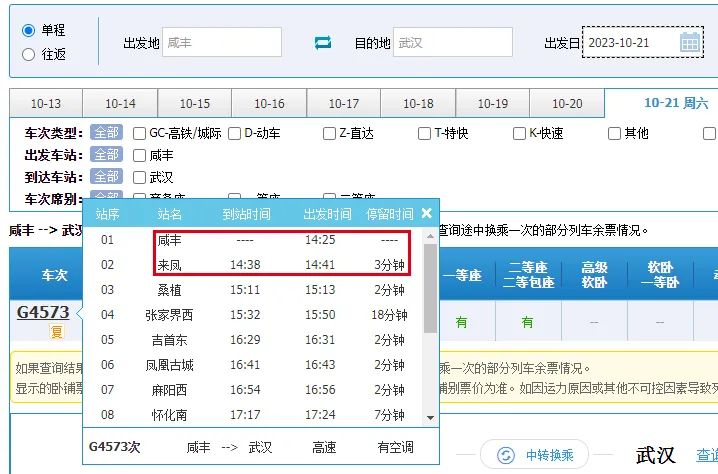 经中国铁路武汉局集团公司批准,2023年10月21日,G4571/4、G4573/2次列车首次开进咸丰、来凤。咸丰、来凤站办理客运营业,咸丰站始发时间14:25,来凤站出发时间14:41,武汉站到达时间21:04,具体开行时刻表请关注“铁路12306” 。
