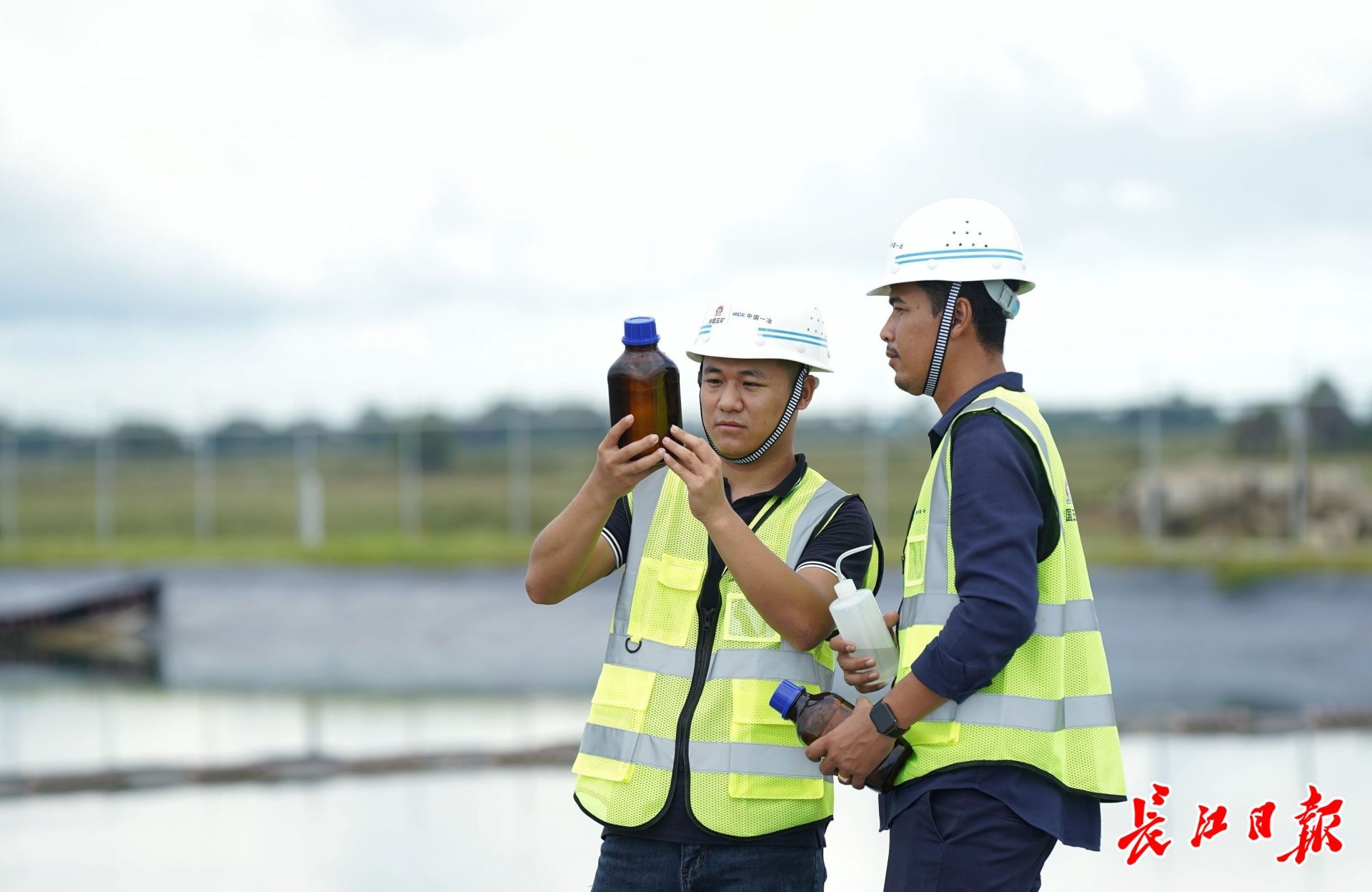 博纳(右)和张露在中国一冶斯登森污水排水工程终端——污水处理站观察水质。长江日报特派记者肖僖 摄