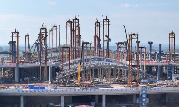 日前,由中铁建工承建的荆门西站一派繁忙景象,东站房、西站房、高架候车层正在有序进行钢结构网架拼装施工。据悉,荆门西站站房混凝土主体结构已经全部完成,无柱雨棚钢结构完成,项目方正按照计划稳步推进建设。(记者 张彩云 摄)