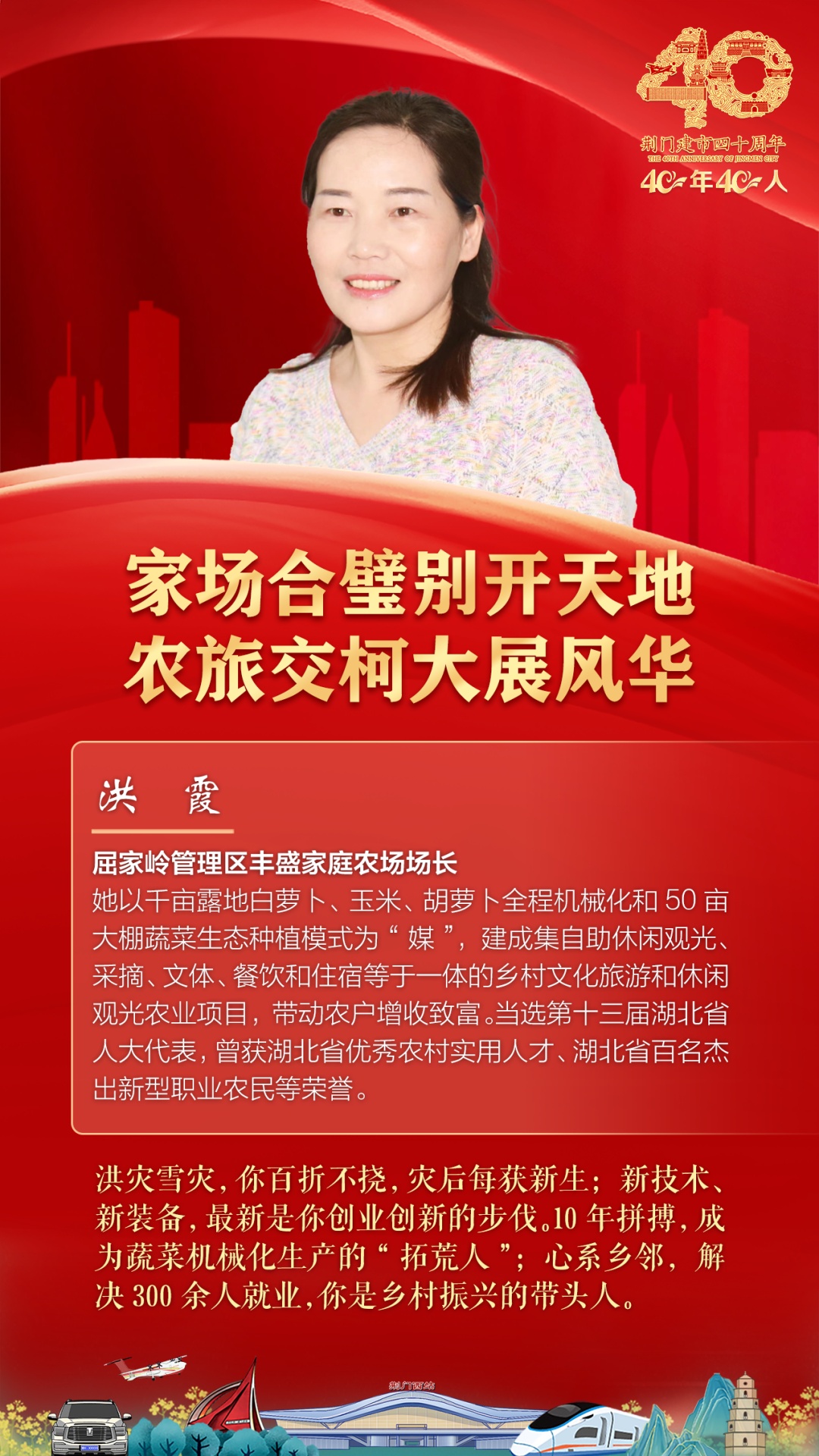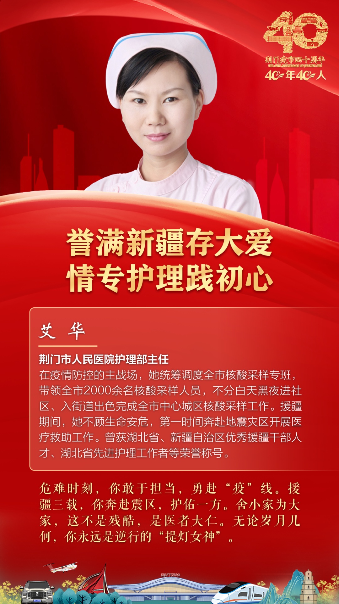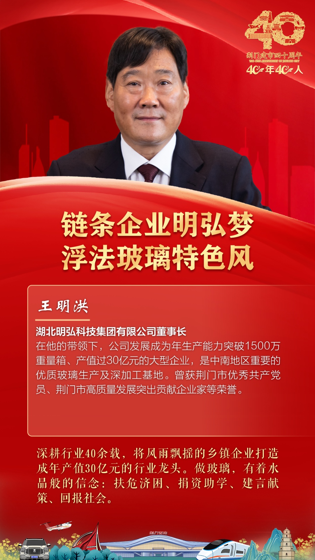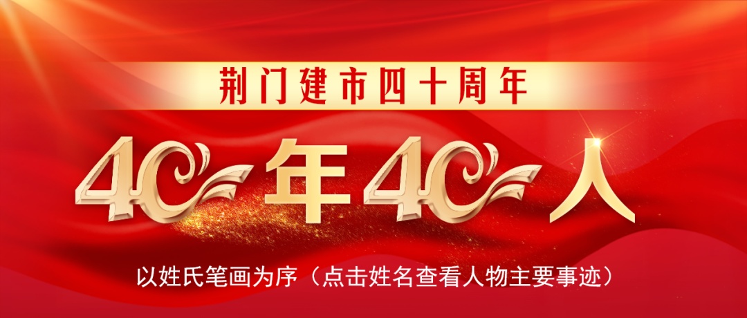 1983年,国务院批准撤销荆门县,成立荆门市。今年是荆门建市40周年,为大力弘扬艰苦创业、实干兴市、创新包容、共建美好的社会新风,生动展现40年来全市人民凝心聚力、接续奋斗取得的伟大成就,市委、市政府在全市范围内开展了荆门“40年•40人•40事”评选活动。经提名推荐、初选审查、网络投票、综合评审,最终评选出了王明洪等40位在荆门40年建设发展中作出突出贡献、得到全市人民高度赞誉的个人,“建立省辖市及行政区划调整”等40件在荆门40年建设发展中产生过重大影响、推动城市发展社会进步且公认度高的事件。