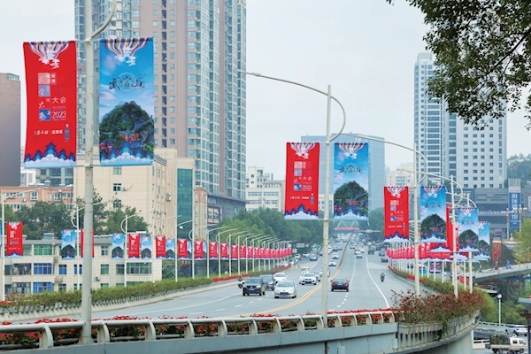 ◀十堰城区主干道两侧悬挂印有2023世界武当太极大会主题标语的灯杆旗。记者全正摄