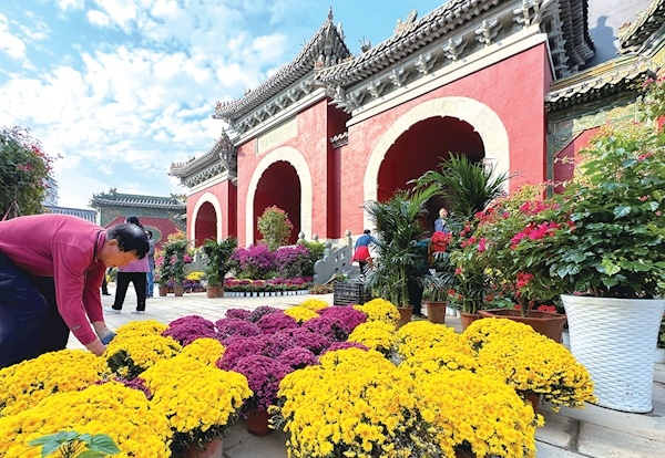 玉虚宫外摆放各种鲜花,喜迎八方宾朋。
