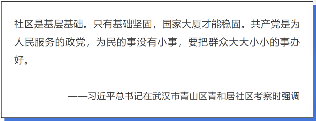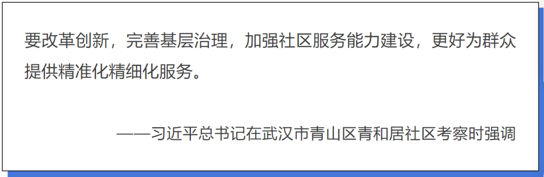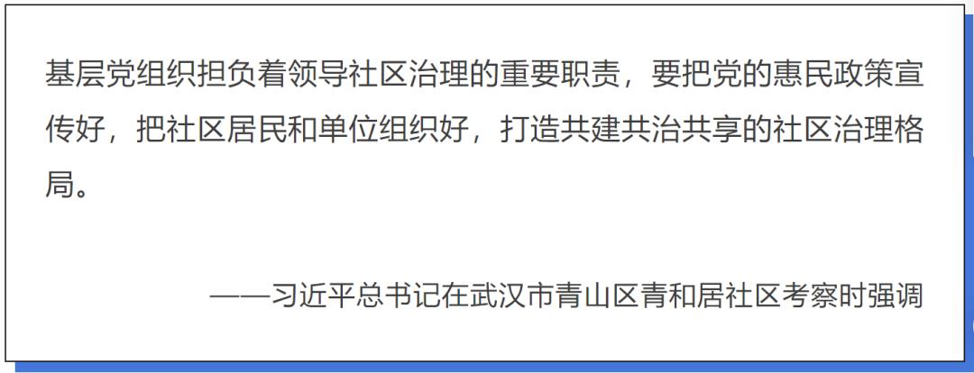 在基层治理中,不少问题是社区解决不了的,我们就发挥大党委的引领作用,整合下沉单位、共建单位以及社会力量,解决老百姓急难愁盼的问题。2017年,青山区有85家职能部门将行政资源、服务力量下沉到社区,各部门对社区一呼即应。除此之外,社区打造的“四点半学校”也成为孩子们的快乐乐园。在“双减”政策之下,我们把孩子们从课堂带到户外,去到戴家湖公园、青山新江滩等“网红打卡地”,更多地为他们提供红色教育、生活教育、社会实践。黑跃荣(青和居社区居民):社区的“天天敲门组”让我印象最深,我无论反映什么事情,社区立马就有人来嘘寒问暖。作为一个老人,得到这样的关怀,感觉很满足。邹红霞(青和居社区居民):近年来,社区新建了停车棚,保障了电动车充电安全。大家还共同改出了一座“再生花园”,装上了很漂亮的休闲椅。我住在这里蛮幸福。桂小妹:下一步,我们将继续牢记习近平总书记殷殷嘱托,团结带领社区的居民,把居民服务好,把社区治理好,把家园建设好。在强国建设、民族复兴的新征程上,贡献我们的力量,把青和居社区打造得越来越好。涂一昂(湖北省社科院马克思主义研究所助理研究员):2007年起,武汉市启动棚改工作。历时10年,工人村地区先后有4万多人搬出工棚,住进楼房。青和居社区也发生巨大变化,由曾经的武汉市最大的公租房小区,变成了青青花园、和谐家园、居民乐园。青和居社区的先进经验表明,要在办好大大小小事的过程中,真正把群众当亲人,把群众的小事当成自己的大事,深刻体悟习近平总书记关于“江山就是人民,人民就是江山”的重要论断,始终坚持把人民至上当成是解决大党独有难题的基点。