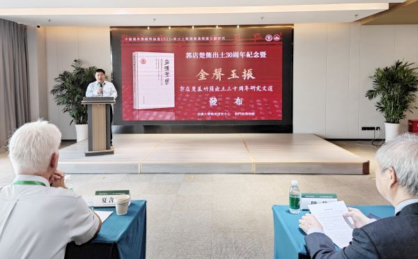 中国简帛学国际论坛2023由武汉大学简帛研究中心、芝加哥大学顾立雅中国古文字学中心、香港浸会大学饶宗颐国学院联合举办,论坛主题为“新出土战国秦汉简牍文献研究”。开幕式上,由武汉大学简帛研究中心和荆门市博物馆联合筹办的郭店楚简出土30周年纪念专题暨《金声玉振:郭店楚墓竹简出土三十周年研究文选》发布,荆门市博物馆馆长汤学锋、荆州博物馆研究员彭浩先生分别致辞。