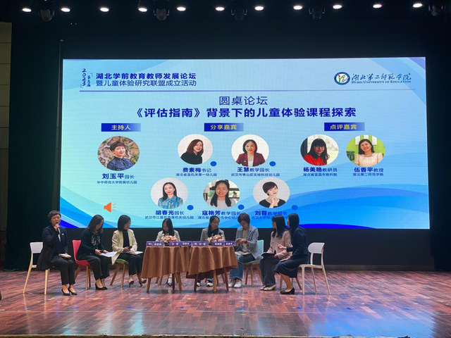 在圆桌论坛中,华中师范大学幼儿园园长刘玉平带领5位省市级示范园园长书记围绕“《评估指南》背景下的儿童体验课程探索”主题进行现场交流。湖北省直机关第一幼儿园费素梅书记、武汉市青山区实验科技幼儿园王慧园长、武汉市江夏区直属机关幼儿园胡春光园长、湖北省老河口市中心幼儿园寇艳芳园长、武汉大学幼儿园分园刘蓉园长分别分享了“童真课程”“幼儿园自然博物馆课程”“荷·和课程”“乐玩课程”“珞珈童梦课程”的园本课程阶段成果,湖北省宜昌市教科院杨美艳研究员、我校伍香平教授同台进行互动指导。