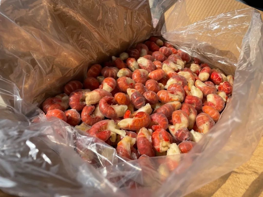 煮熟的鲜红色小龙虾在他们戴着胶皮手套的指尖翻飞跳跃——掐头、去壳、抽虾线、清洗,不到五秒钟,一颗完整的虾仁就被剥好,落入成排的铝制小碗。随后,成吨的虾仁会经历质量检验、再度清洗、包装加味、热熔塑封以及冷冻贴标等工序后,被运往万里之遥的欧洲市场。