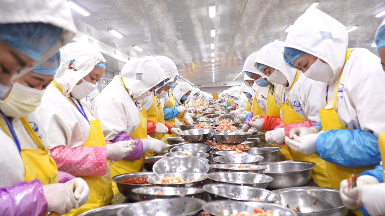 下午四点,在潜江市湖耕食品有限公司,工人们忙着收购新鲜出塘的小龙虾,经过分拣、超声波清洗、蒸煮等流程,一盒盒预制小龙虾就可以出厂销售了。